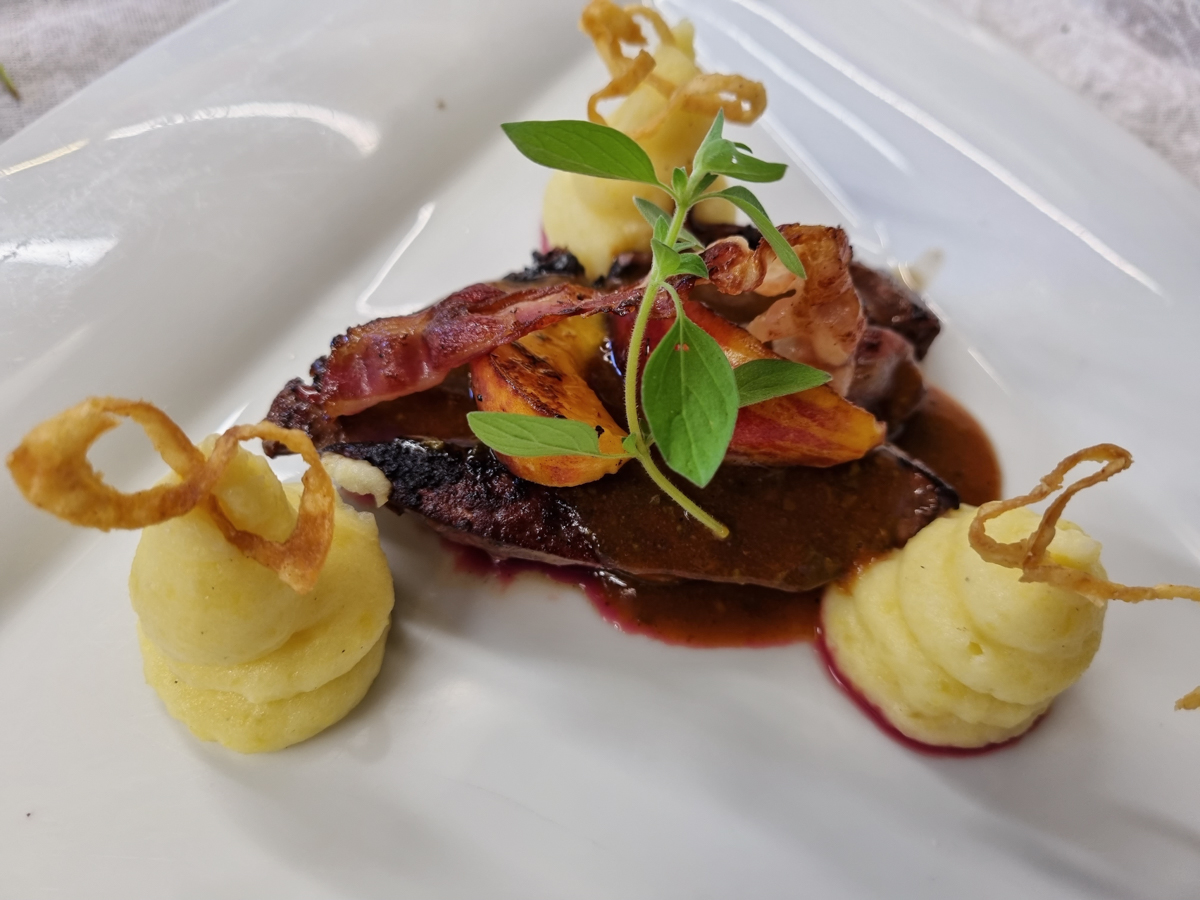 Majoranjus, Apfel, Speck, Karoffelpüreé
