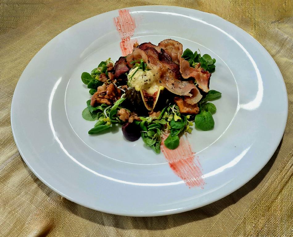 mit Honig überbacken, Vogerlsalat, Orangen-Walnußdressing, Tomatenpesto